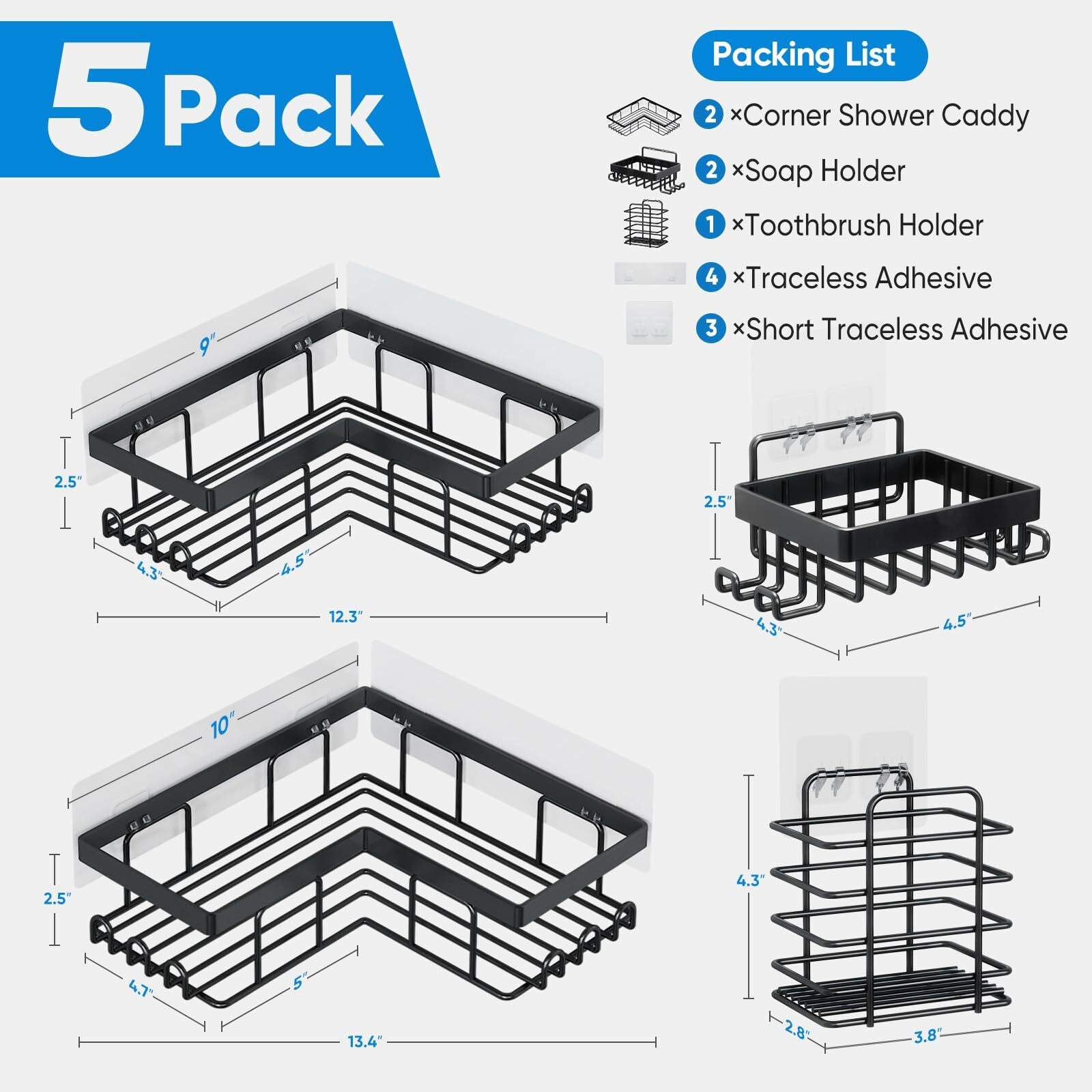 ALLJOY Corner Adhesive Shower Caddy, Rustproof Stainless Steel Bathroom Organizer, No Drilling Wall Mounted Rack, Black, 5-Pack